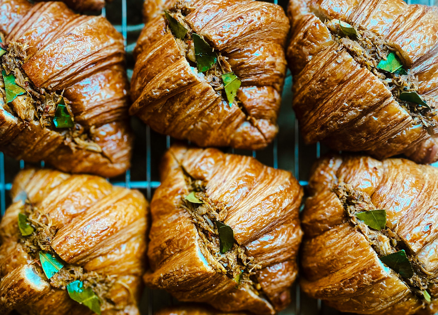 Rich, tender and aromatic shredded chicken infused with spice paste enveloped in a golden croissant topped with fresh lime leaves.