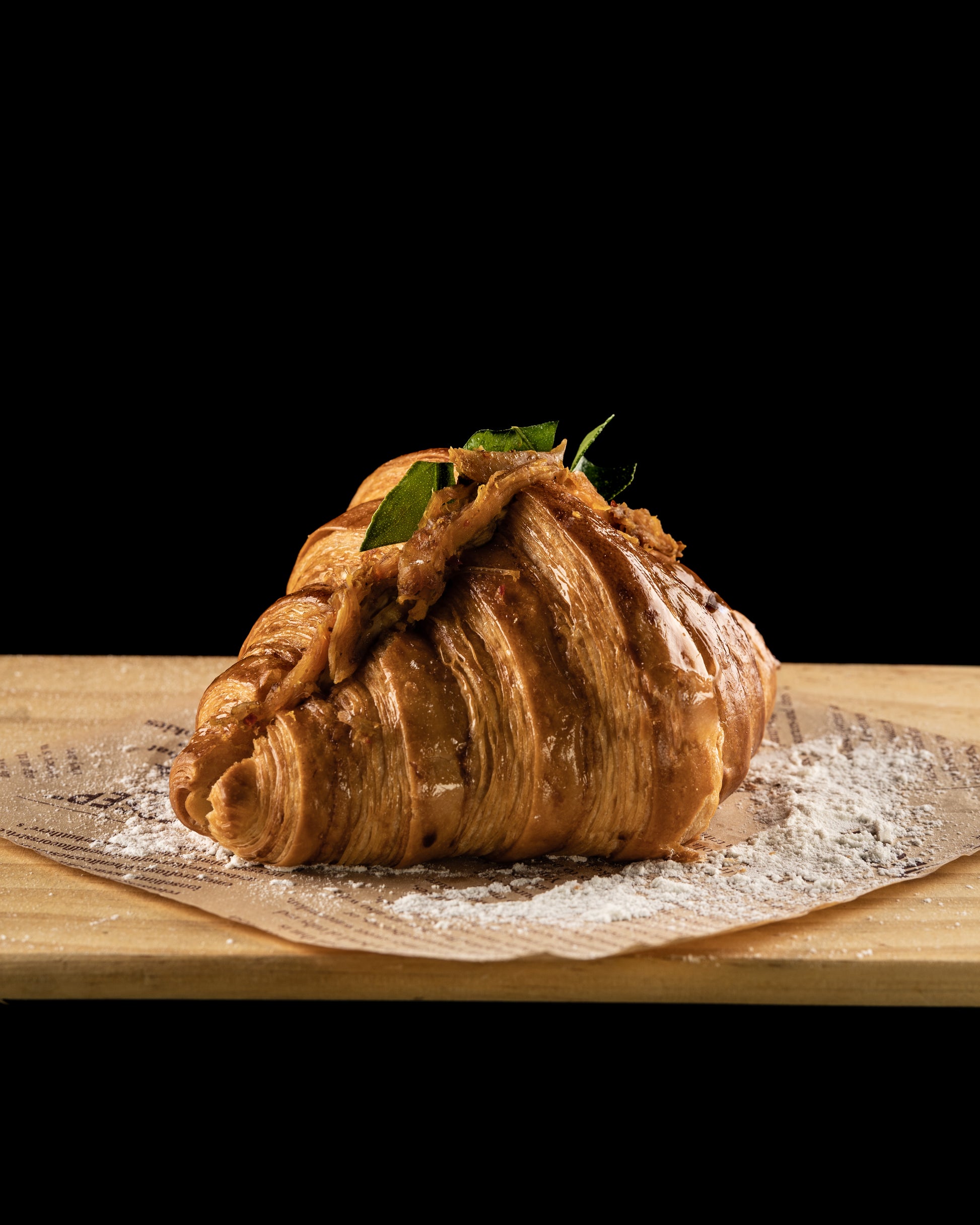 Rich, tender and aromatic shredded chicken infused with spice paste made of garlic, dried chillies, onions, turmeric, ginger with lemongrass and galangal; simmered on low heat for hours enveloped in a golden flakey croissant topped with fresh lime leaves.