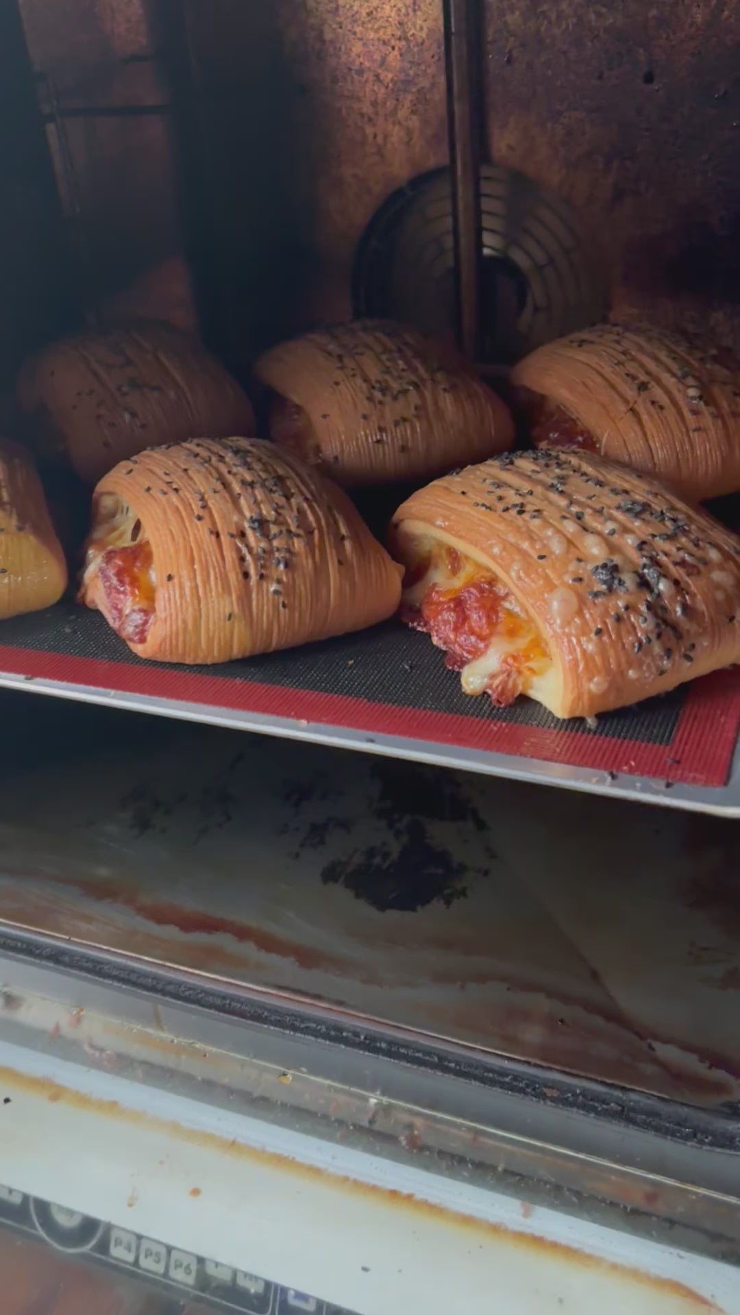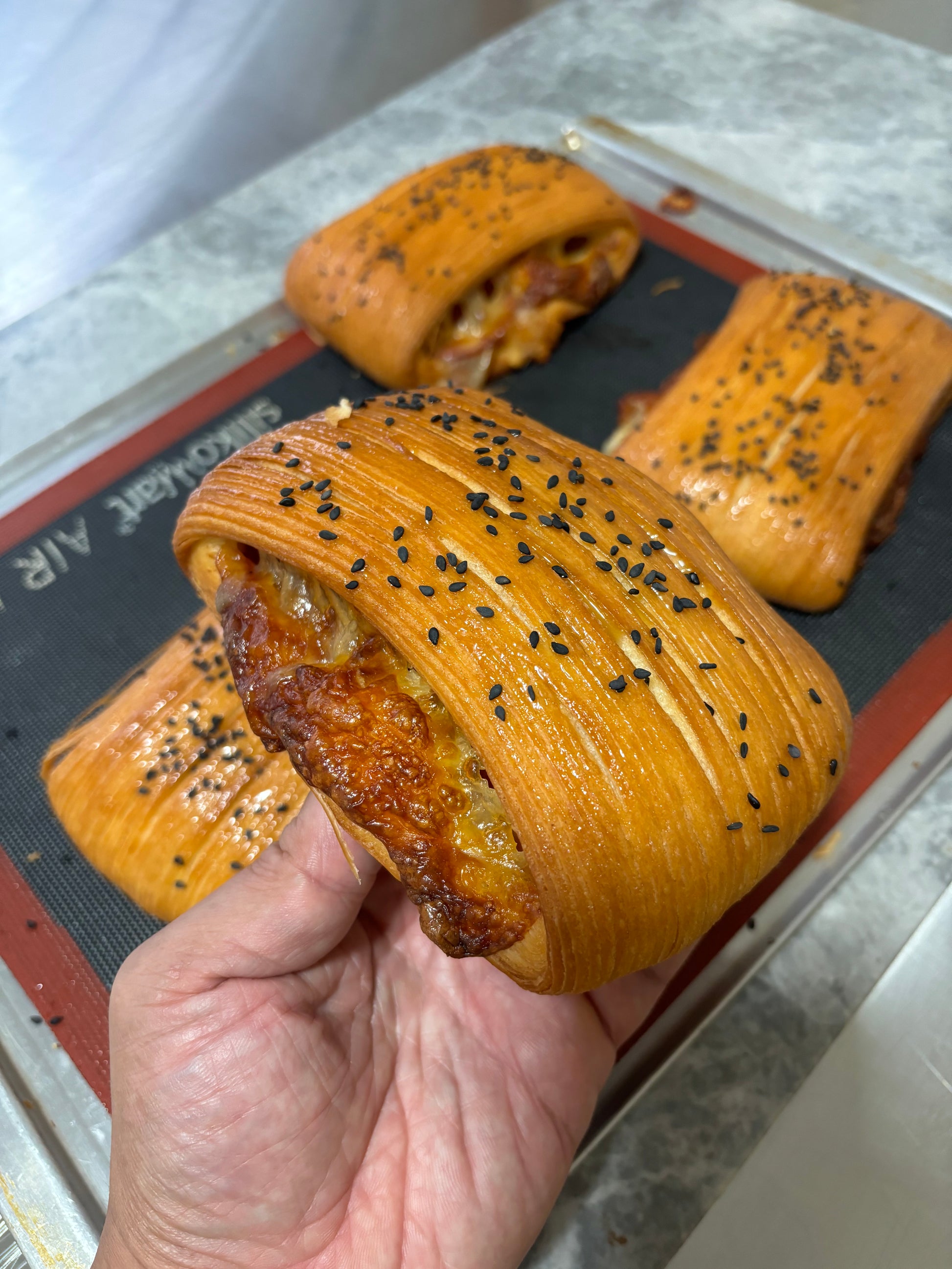 Croissant dough with sautéed garlic turkey ham baked with Gruyère and cheddar and glazed with a honey Dijon mustard sauce.